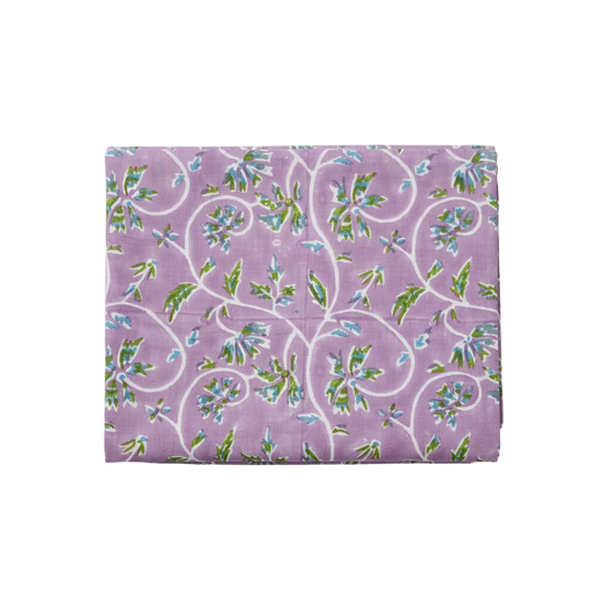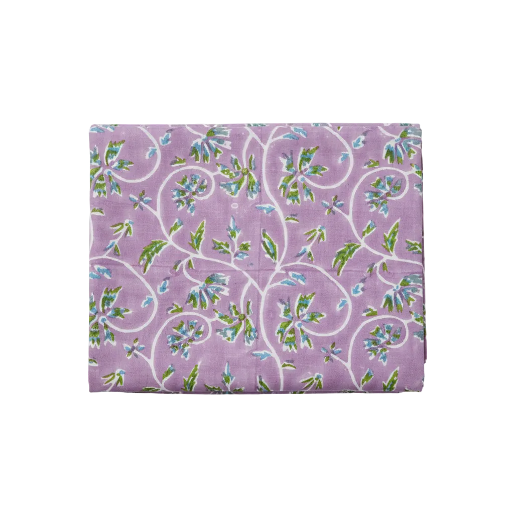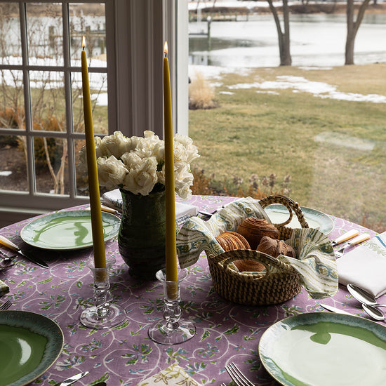 A block-printed botanical vine print, Marguerite adds a splash of color to any space. The imagined leaf-like floral blooming across the undulating vine was inspired by arid gardens in southern India. The lavender adds a happy splash to your table.