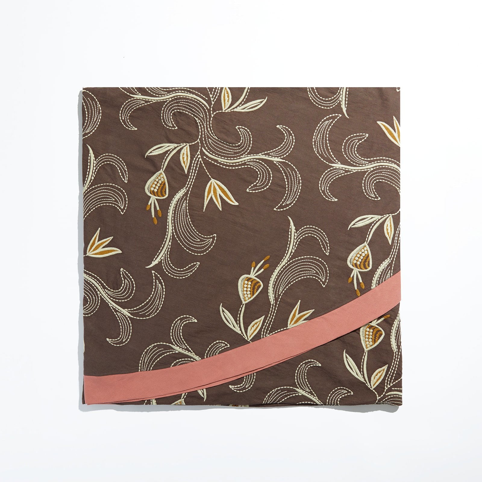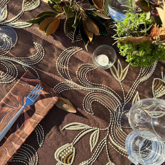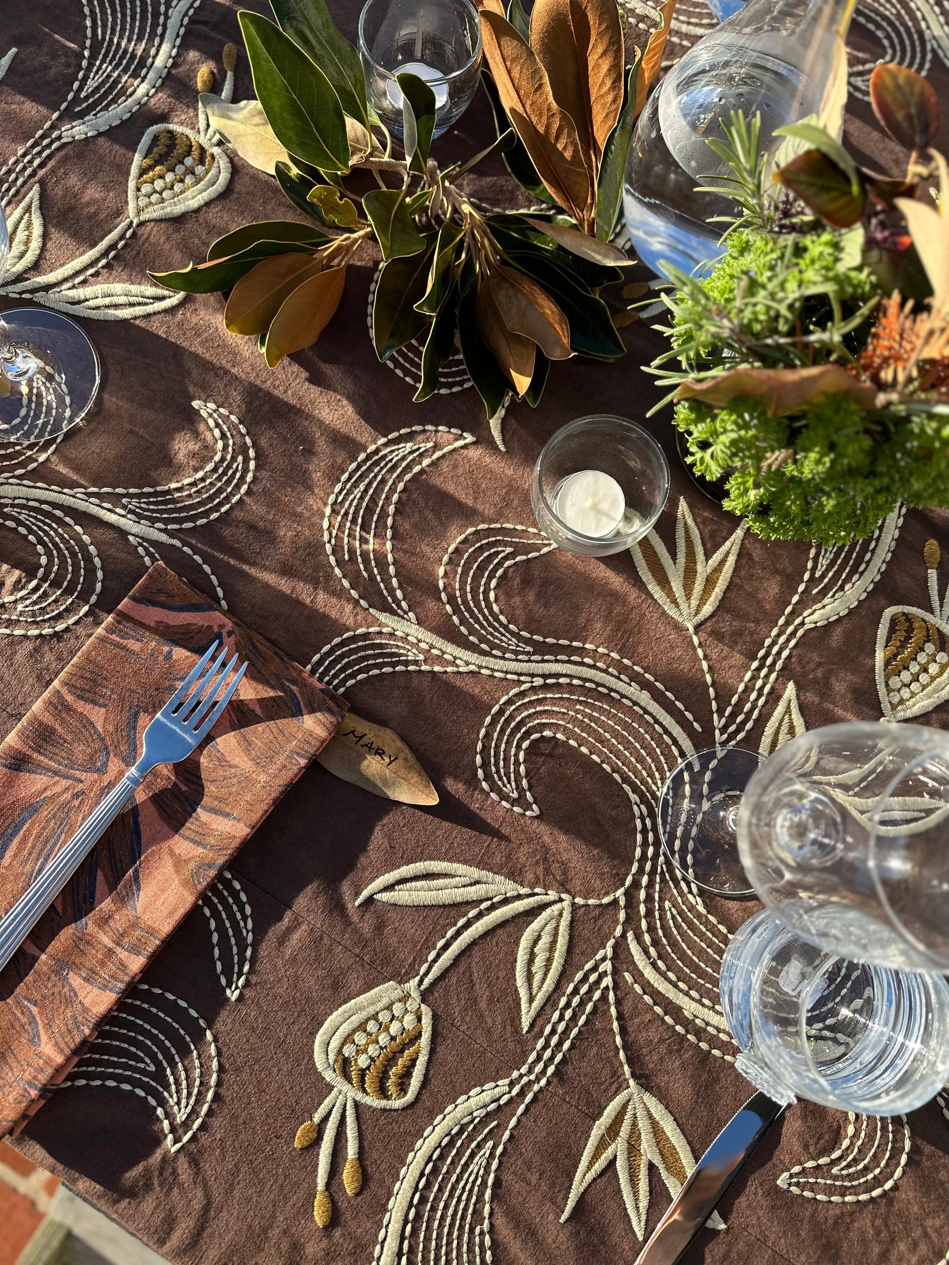 The intricate and irregular stitching creates a stunning display of a lively poppy garden. Featuring rich browns, blush, and ochre hues, this tablecloth adds a unique touch to any table setting.