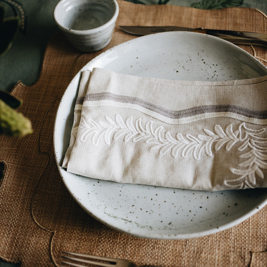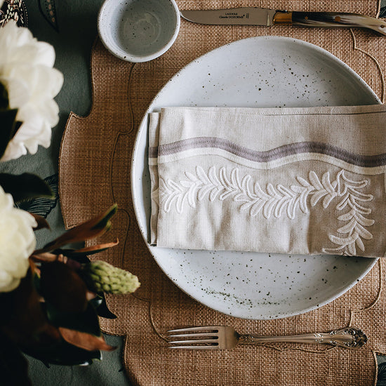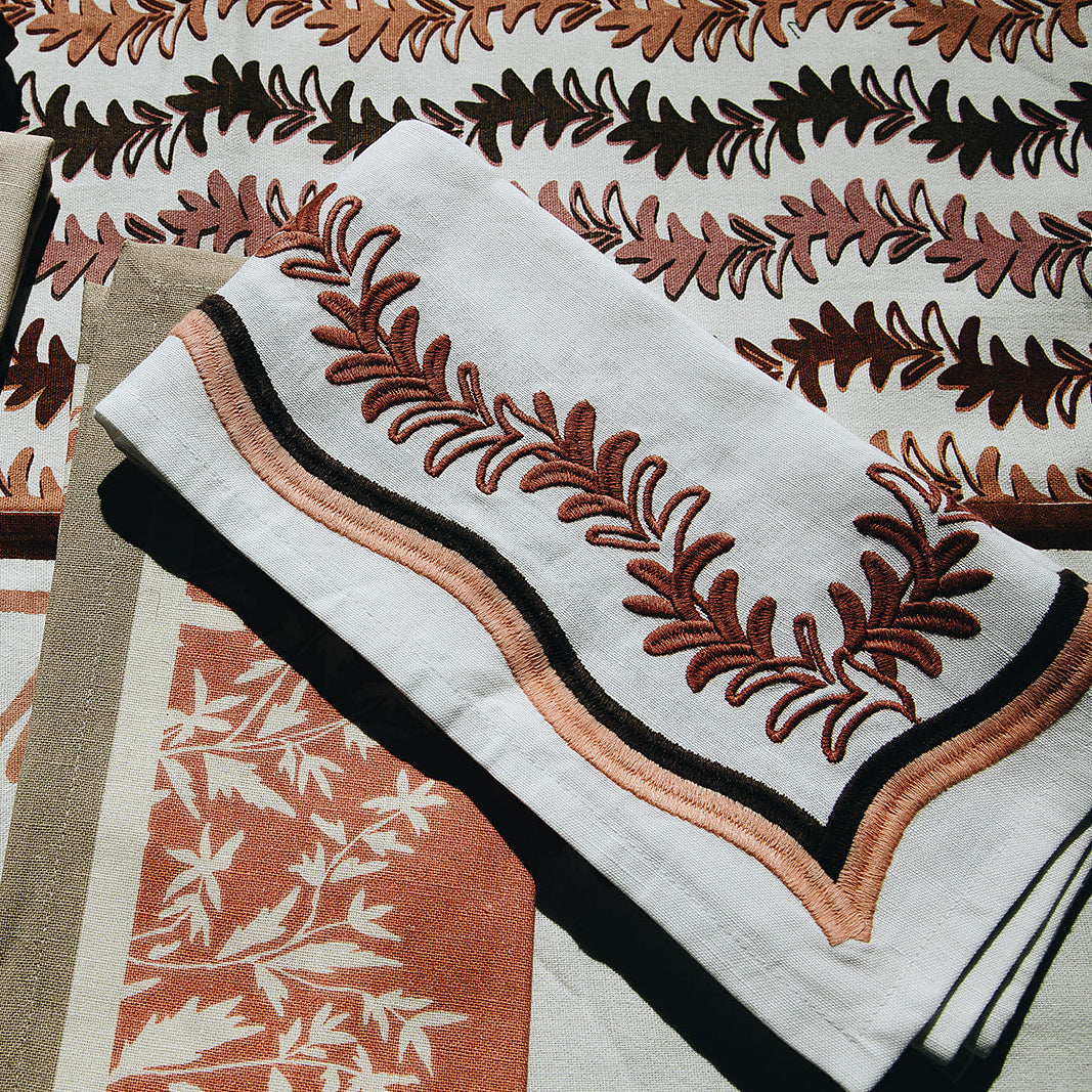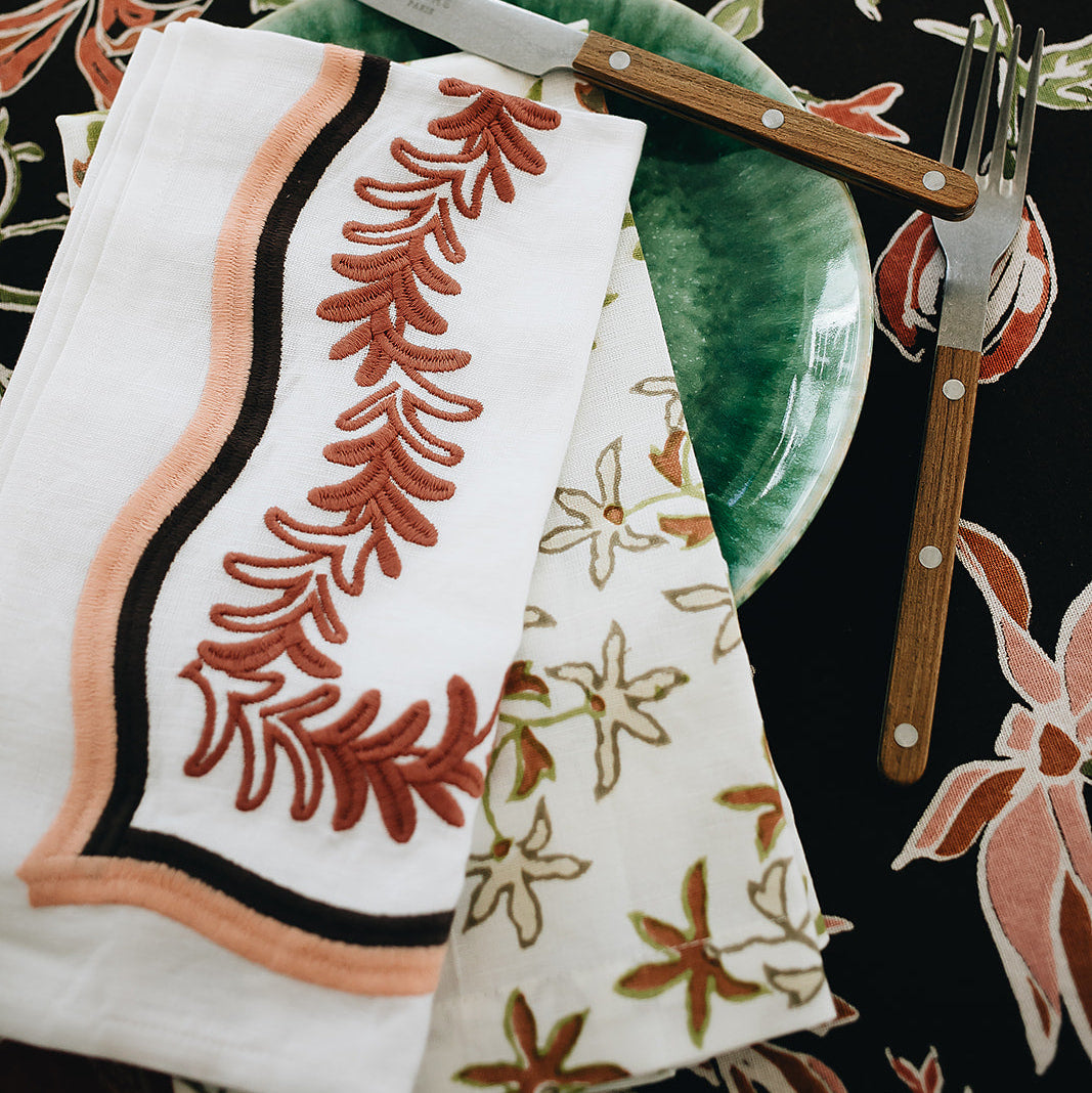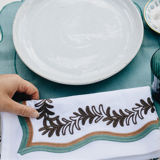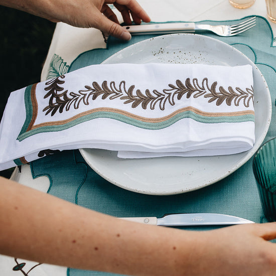 A playful embroidered leaf silhouette, our Palmerie napkin adds a pop of sophisticated color to the table.