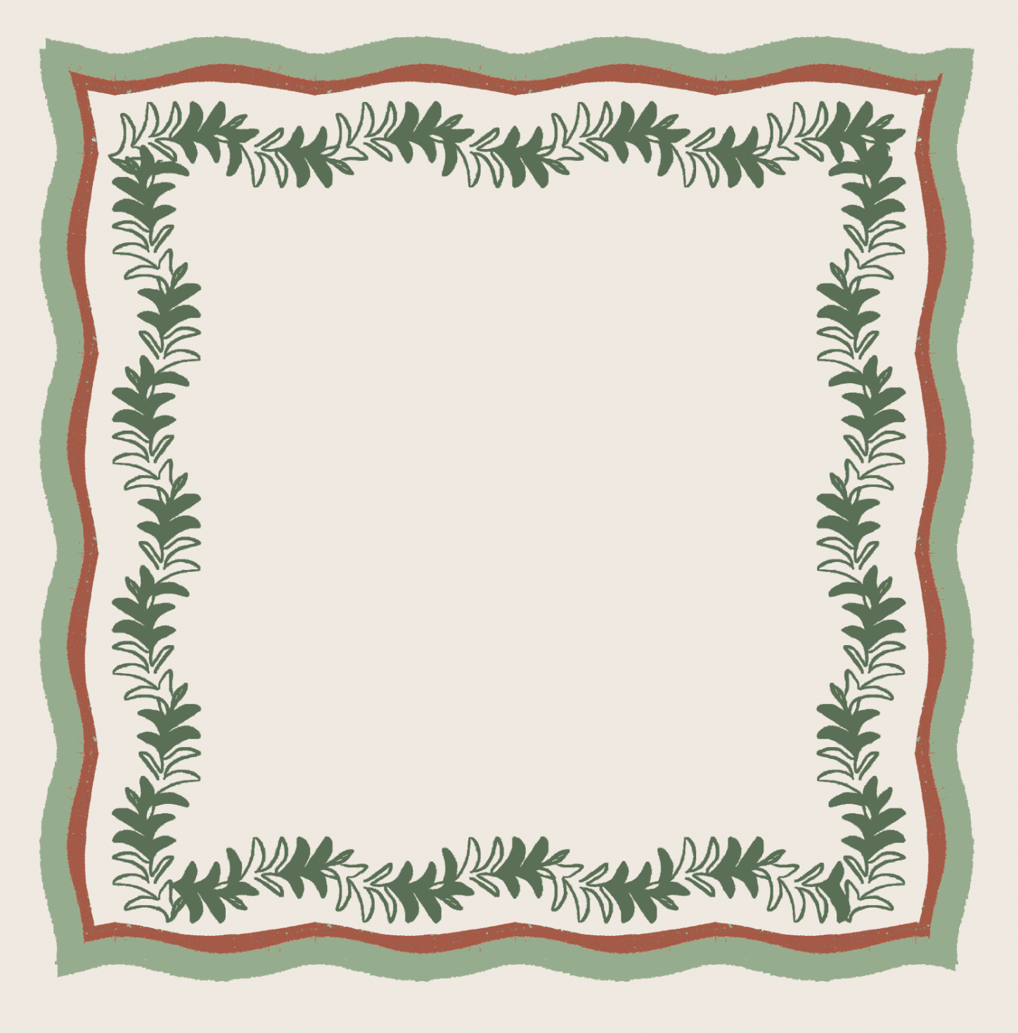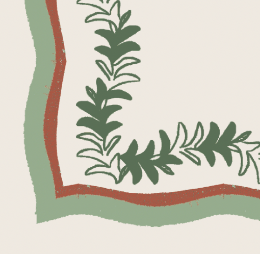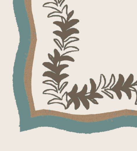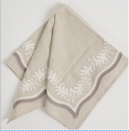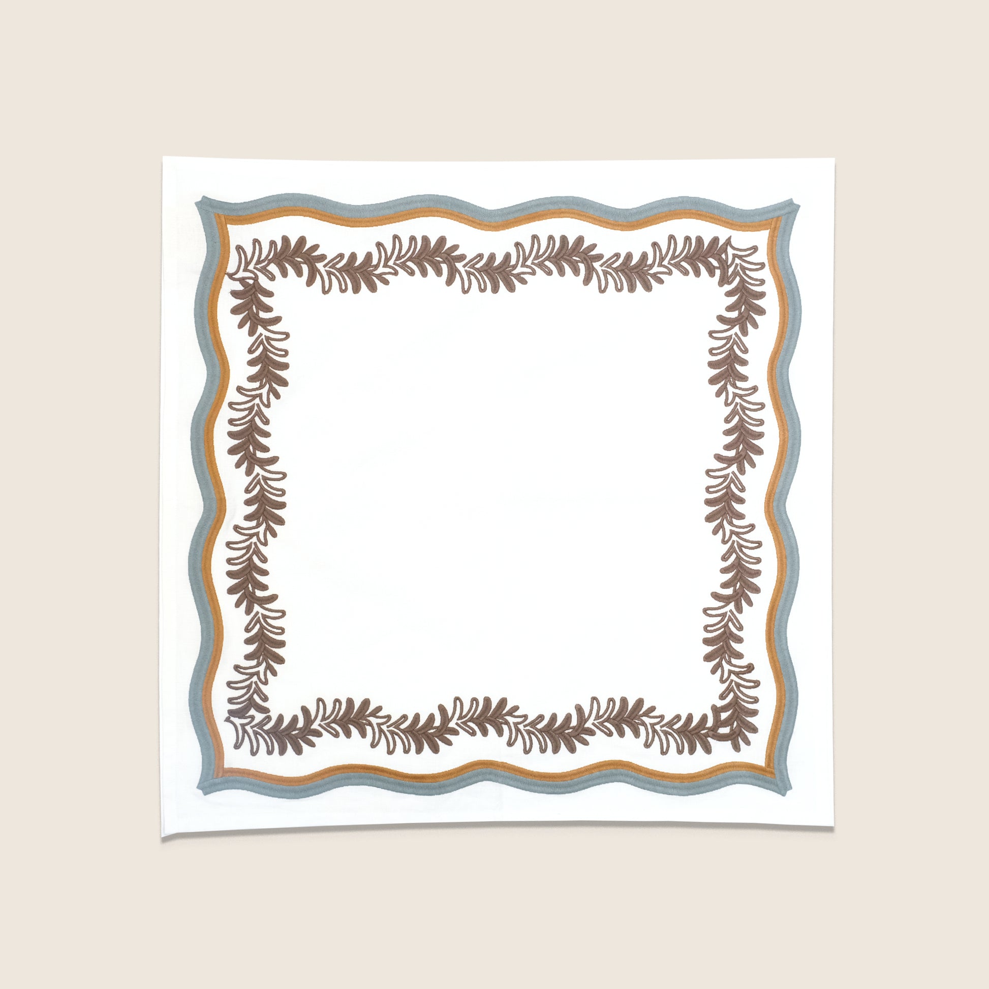The undulating fronds are brought to life with a textural satin stitch and doubled scalloped trim in contrasting colors, adding heightened visual intrigue.