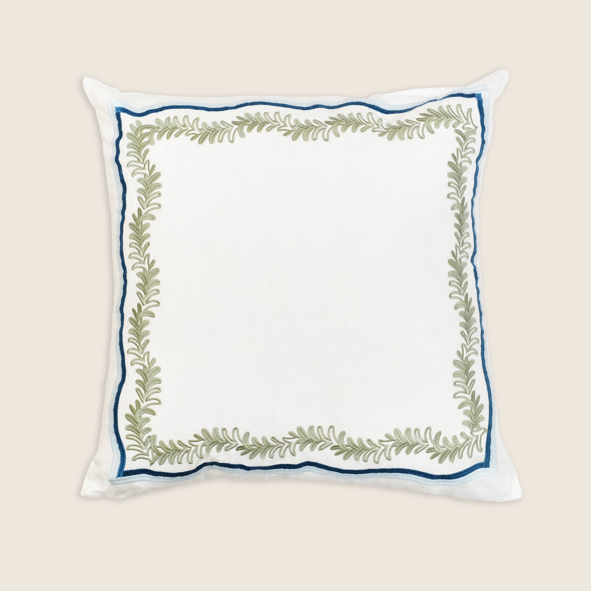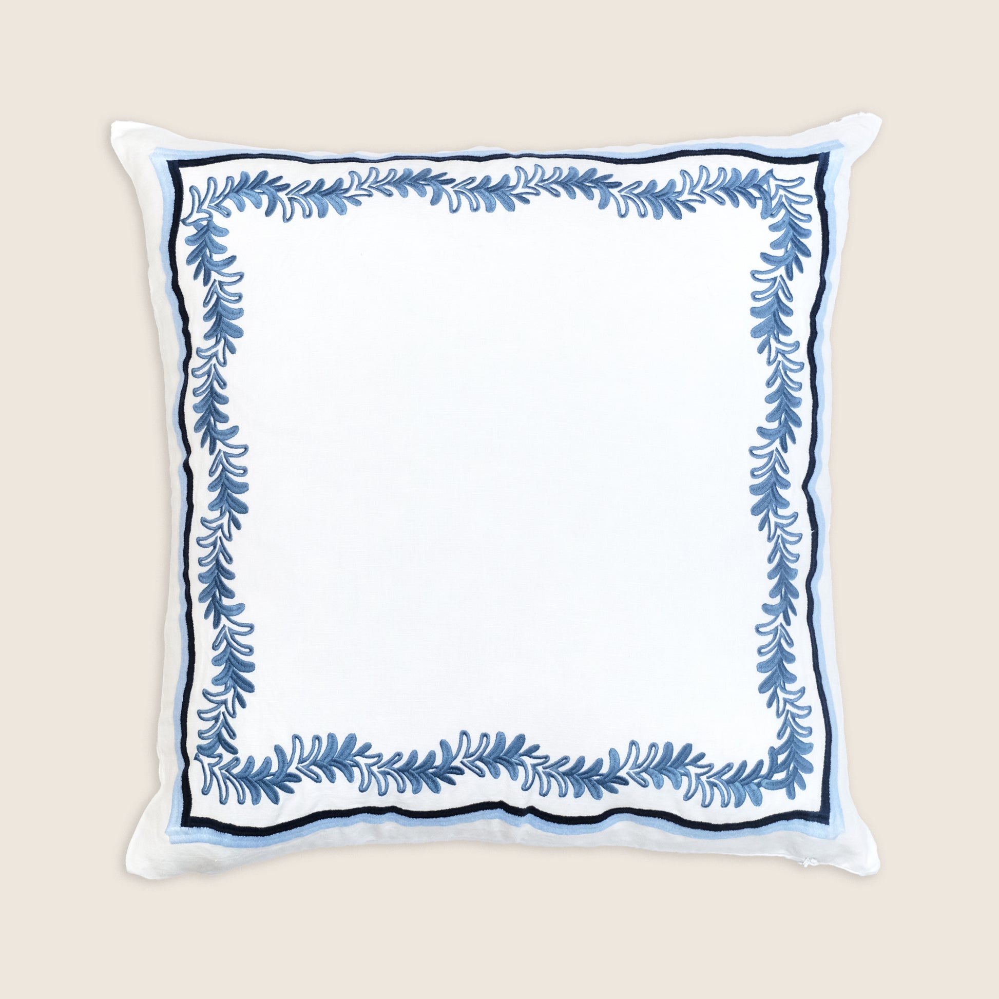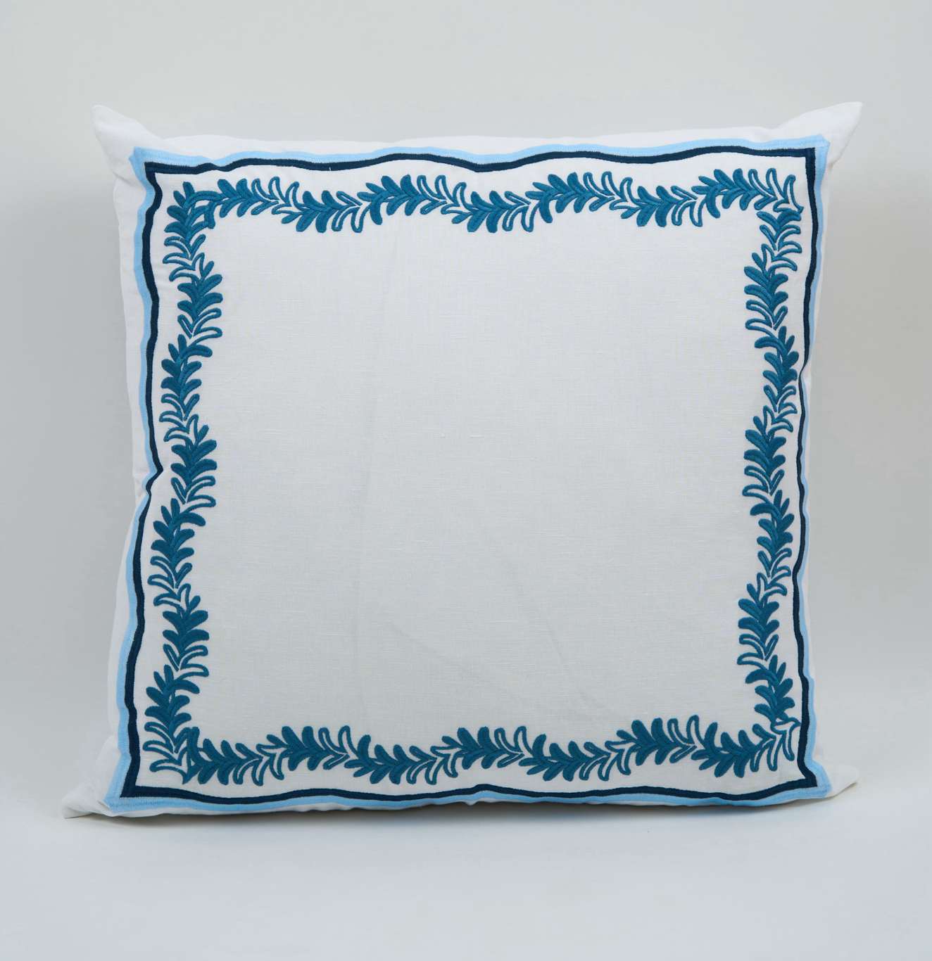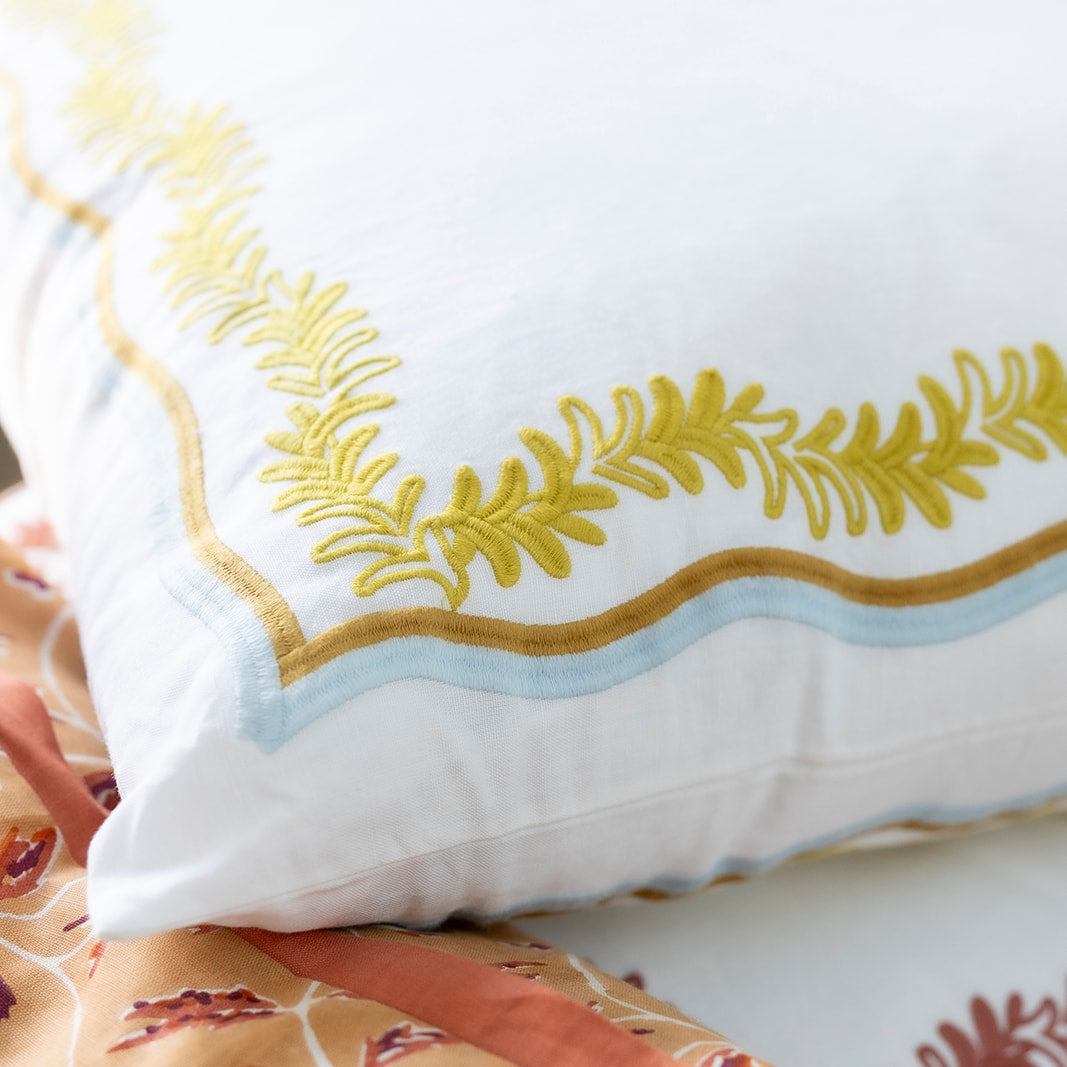 Experience a burst of color at home with our Palmerie pillow. The playful embroidered leaf silhouette, textural satin stitch, and scalloped trim in contrasting colors create a stunning visual effect.
