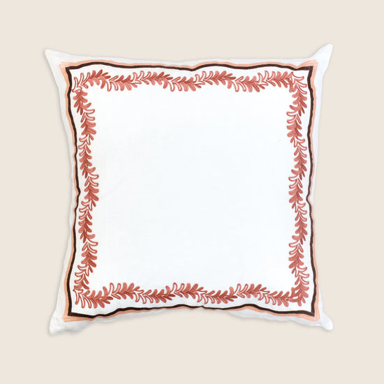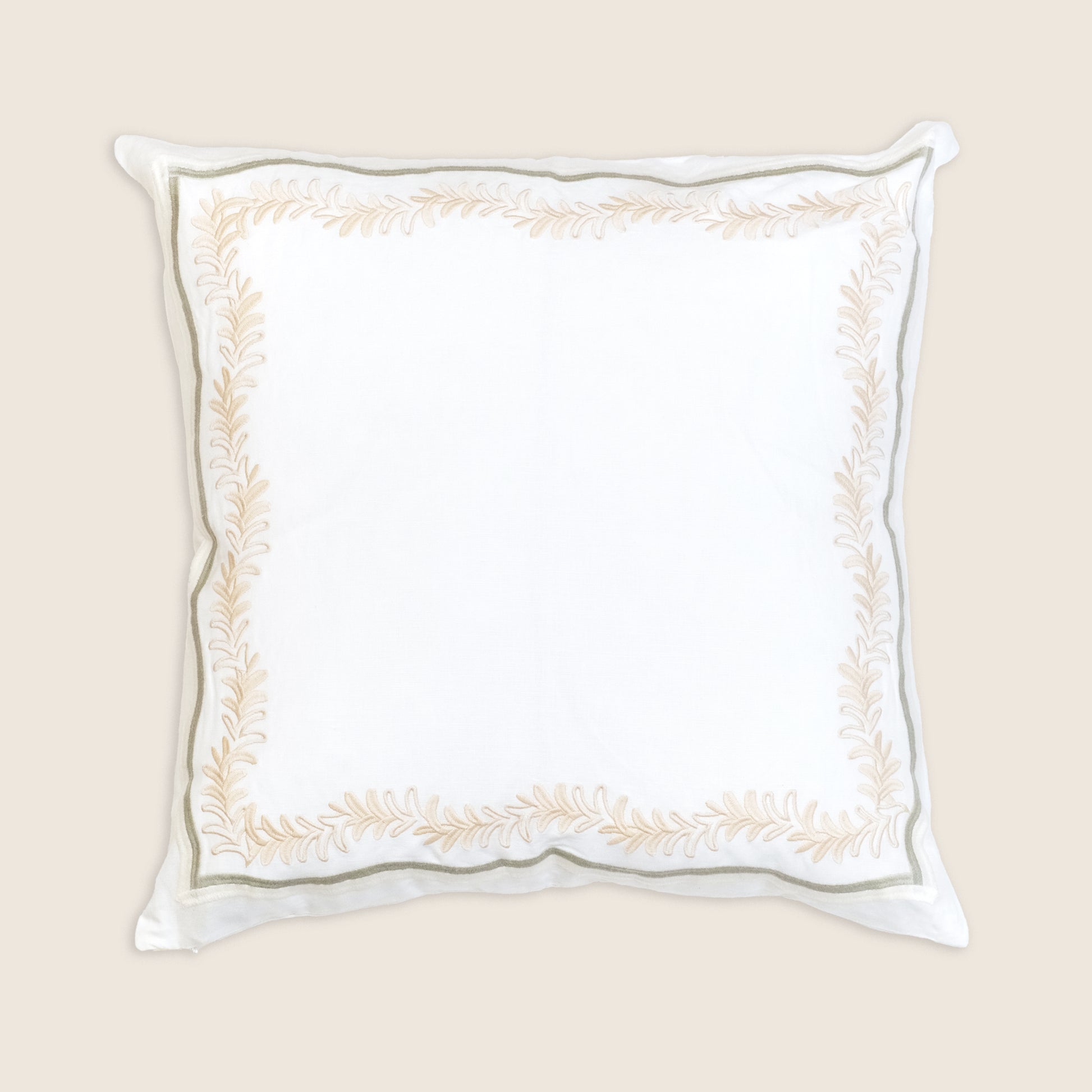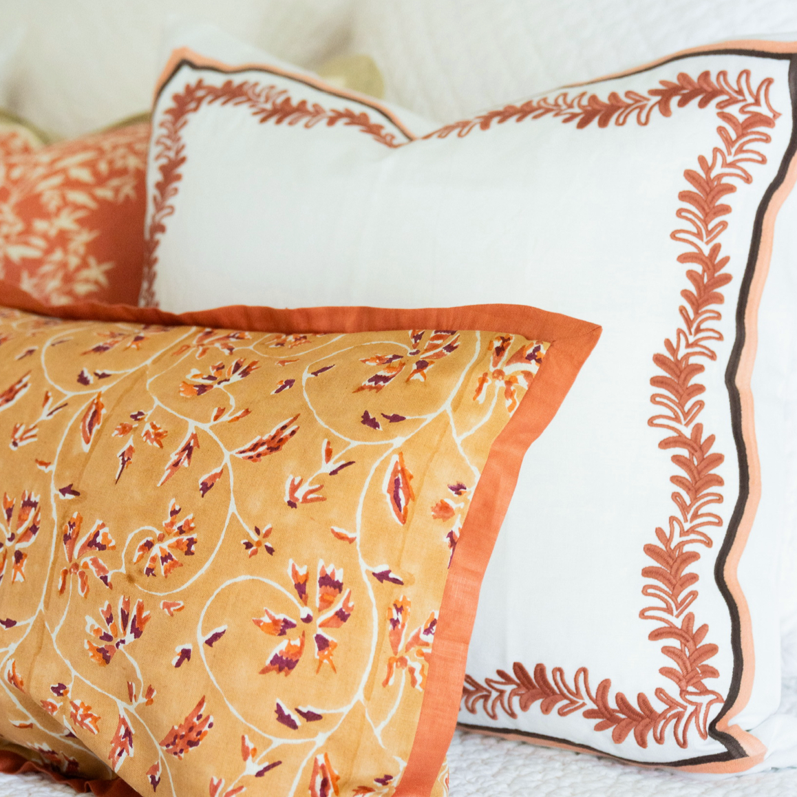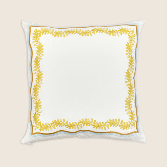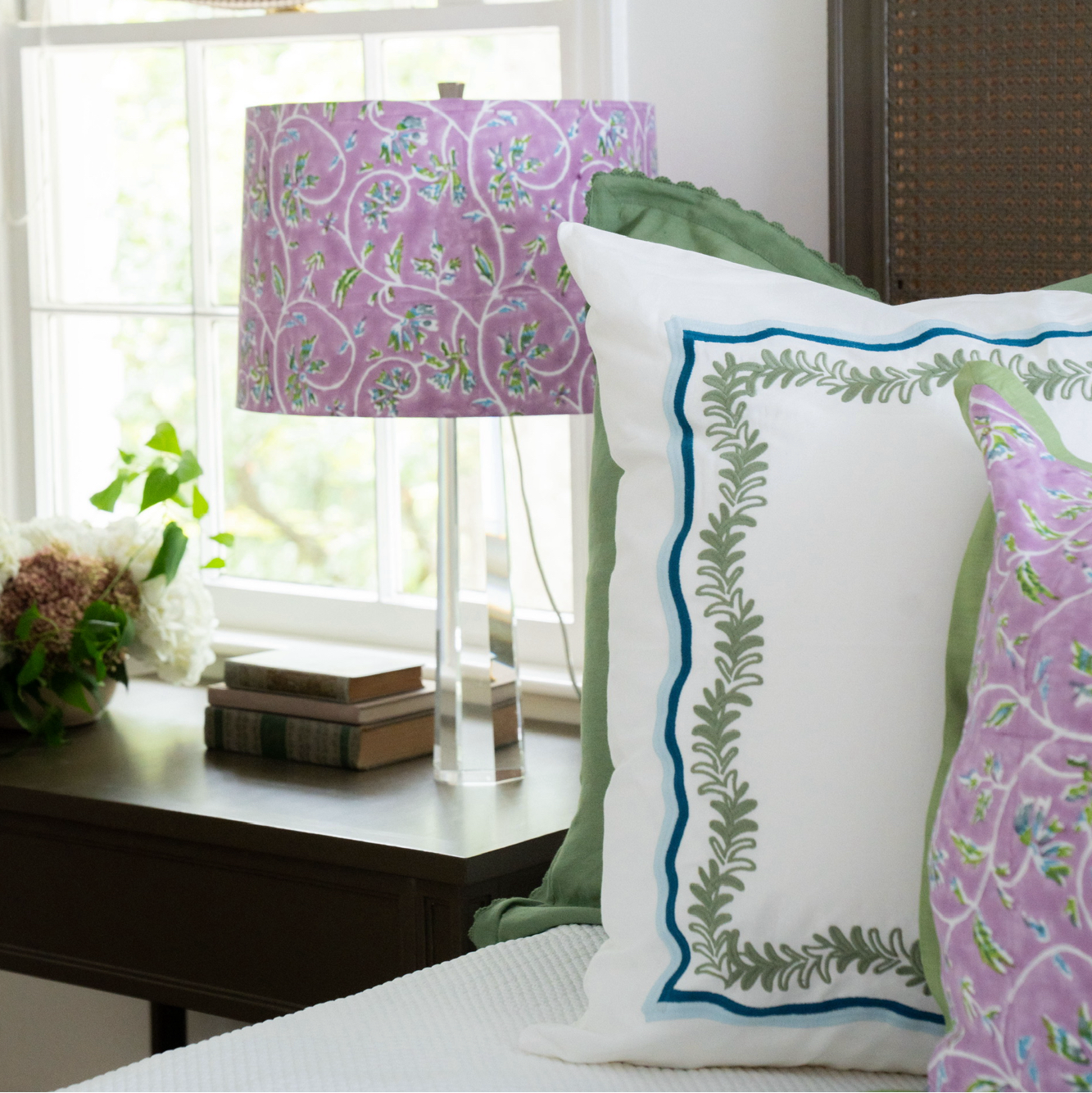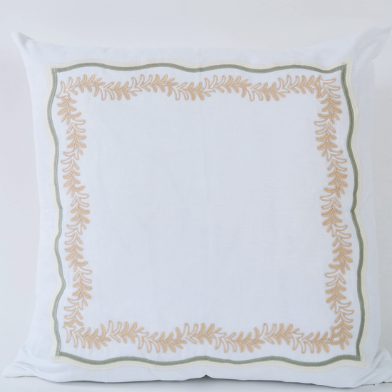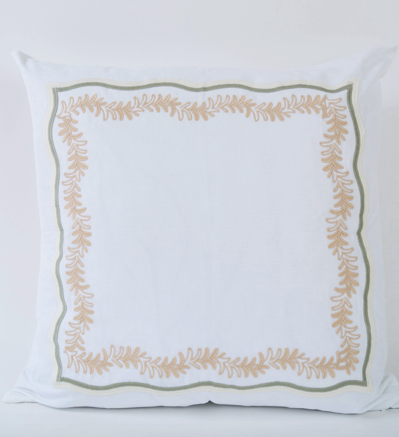 Experience a burst of color at home with our Palmerie pillow. The playful embroidered leaf silhouette, textural satin stitch, and scalloped trim in contrasting colors create a stunning visual effect.