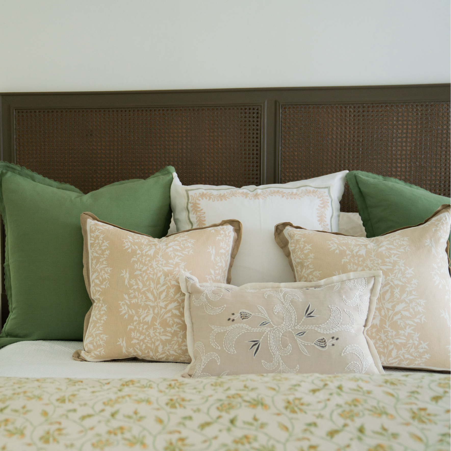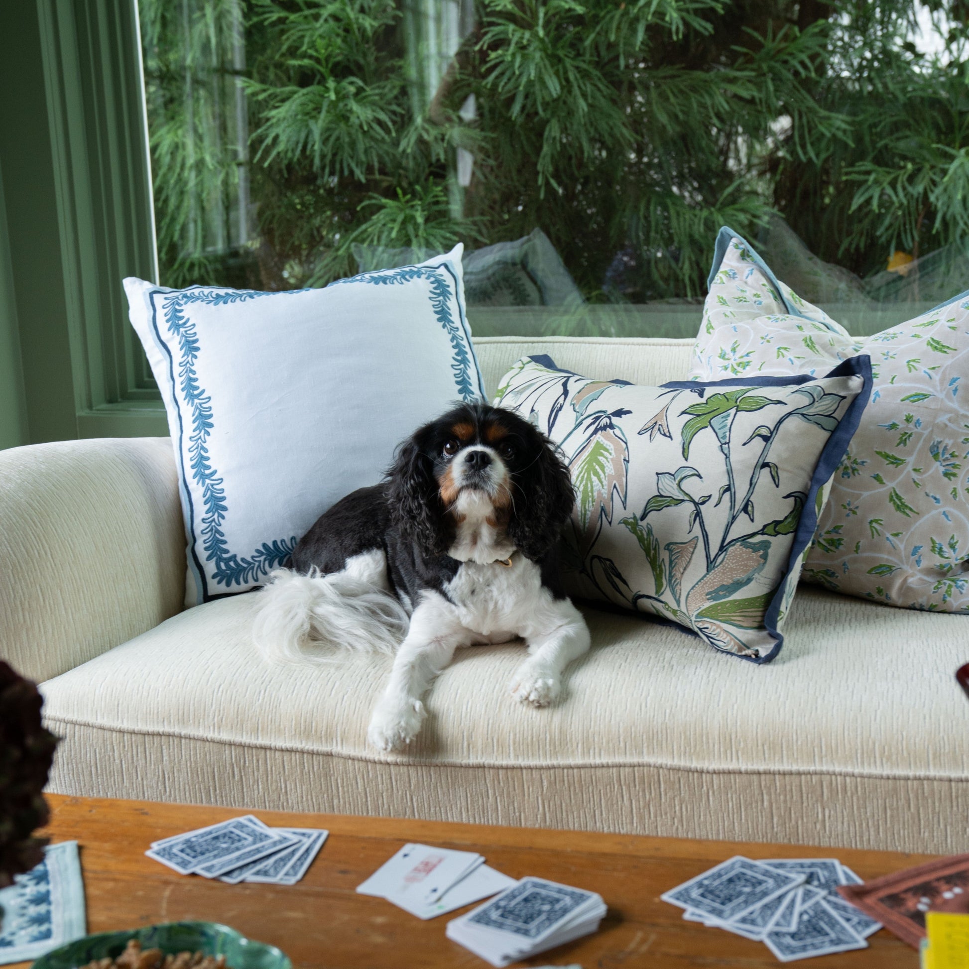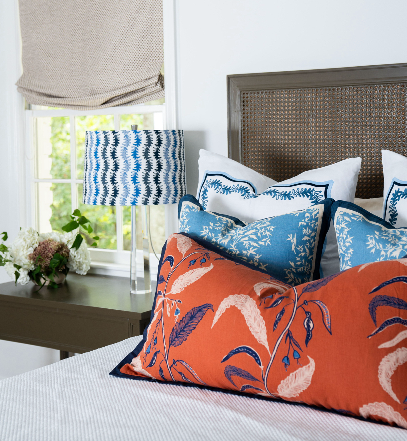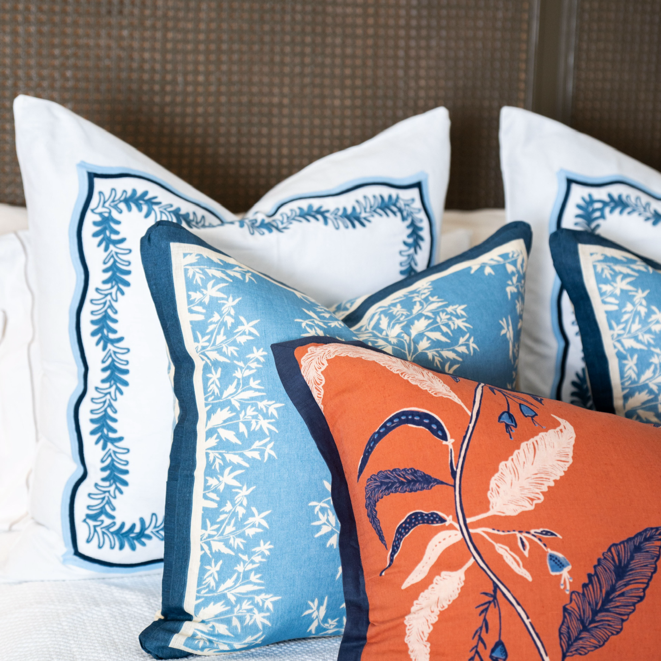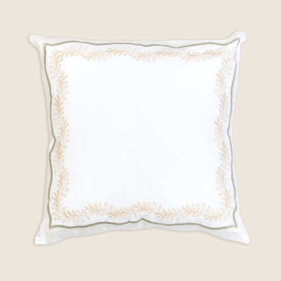 Experience a burst of color at home with our Palmerie pillow. The playful embroidered leaf silhouette, textural satin stitch, and scalloped trim in contrasting colors create a stunning visual effect.