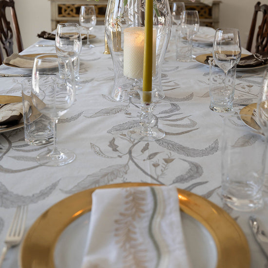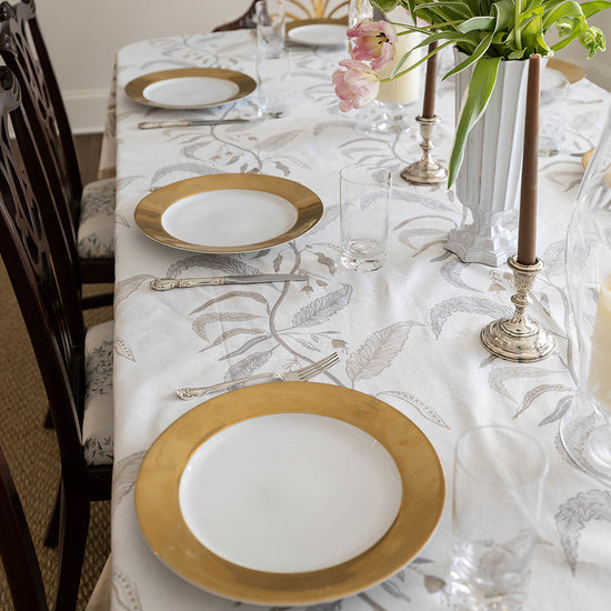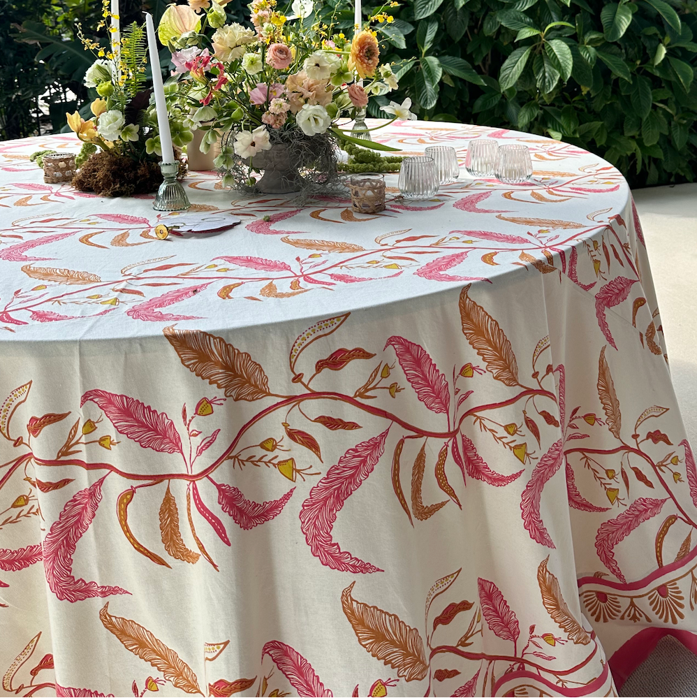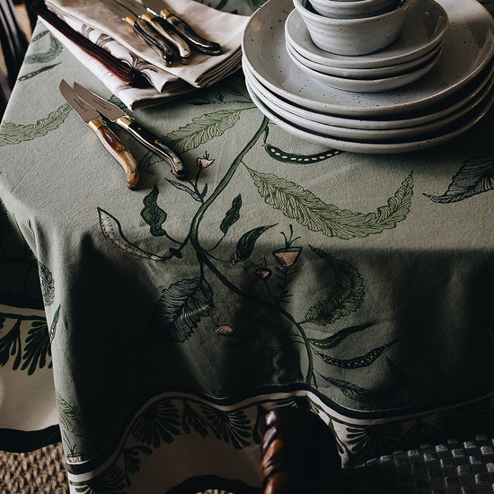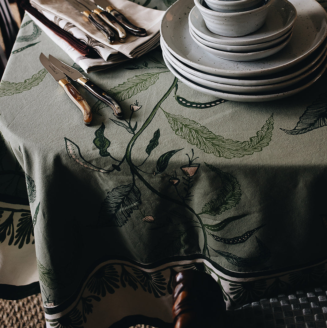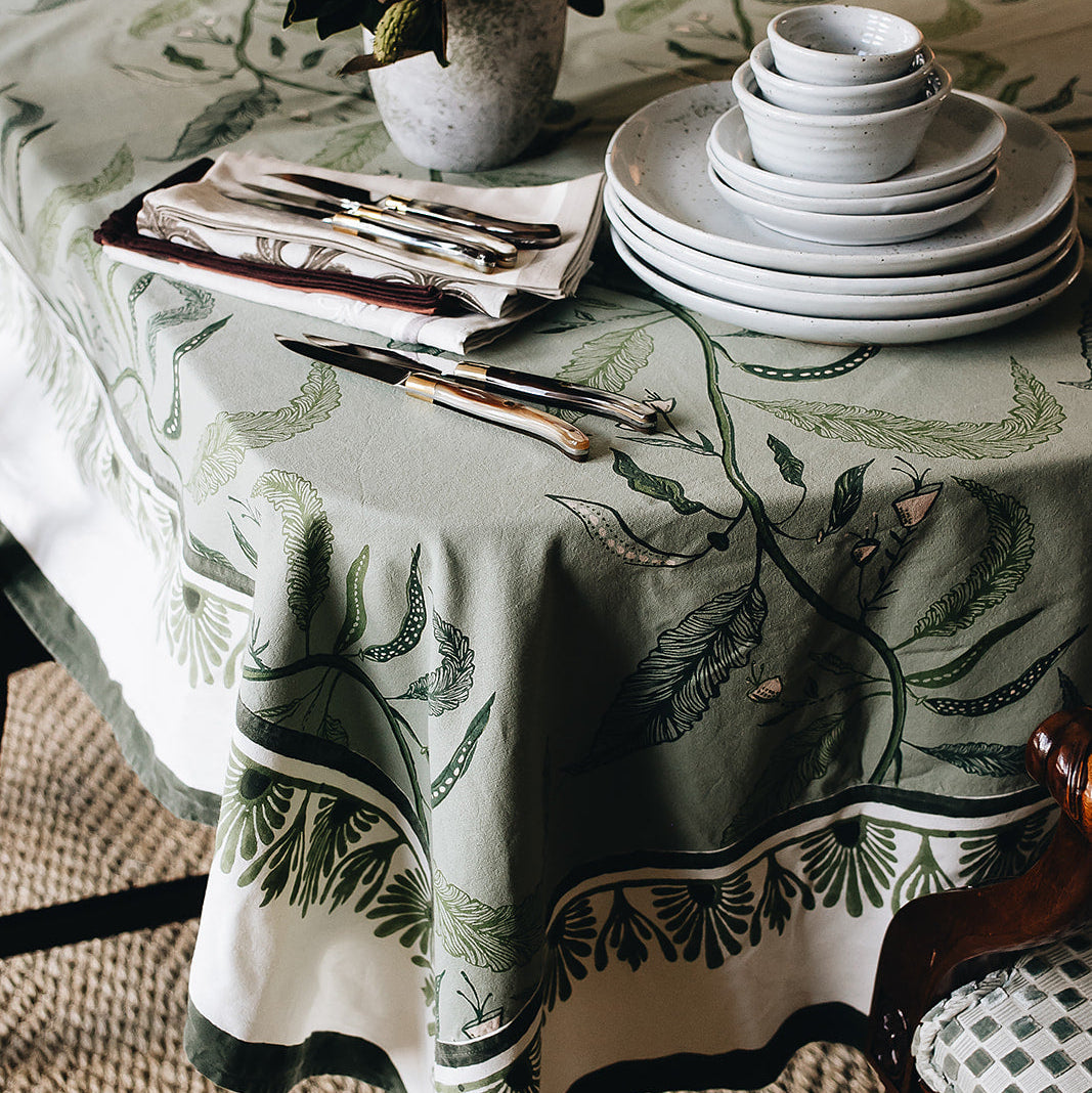 Our Tuileries tablecloth has become a signature design in our collection. The repeated vine motif inspired by European florals comes to life through hand screen printing, and includes and added detail of a block printed trim.