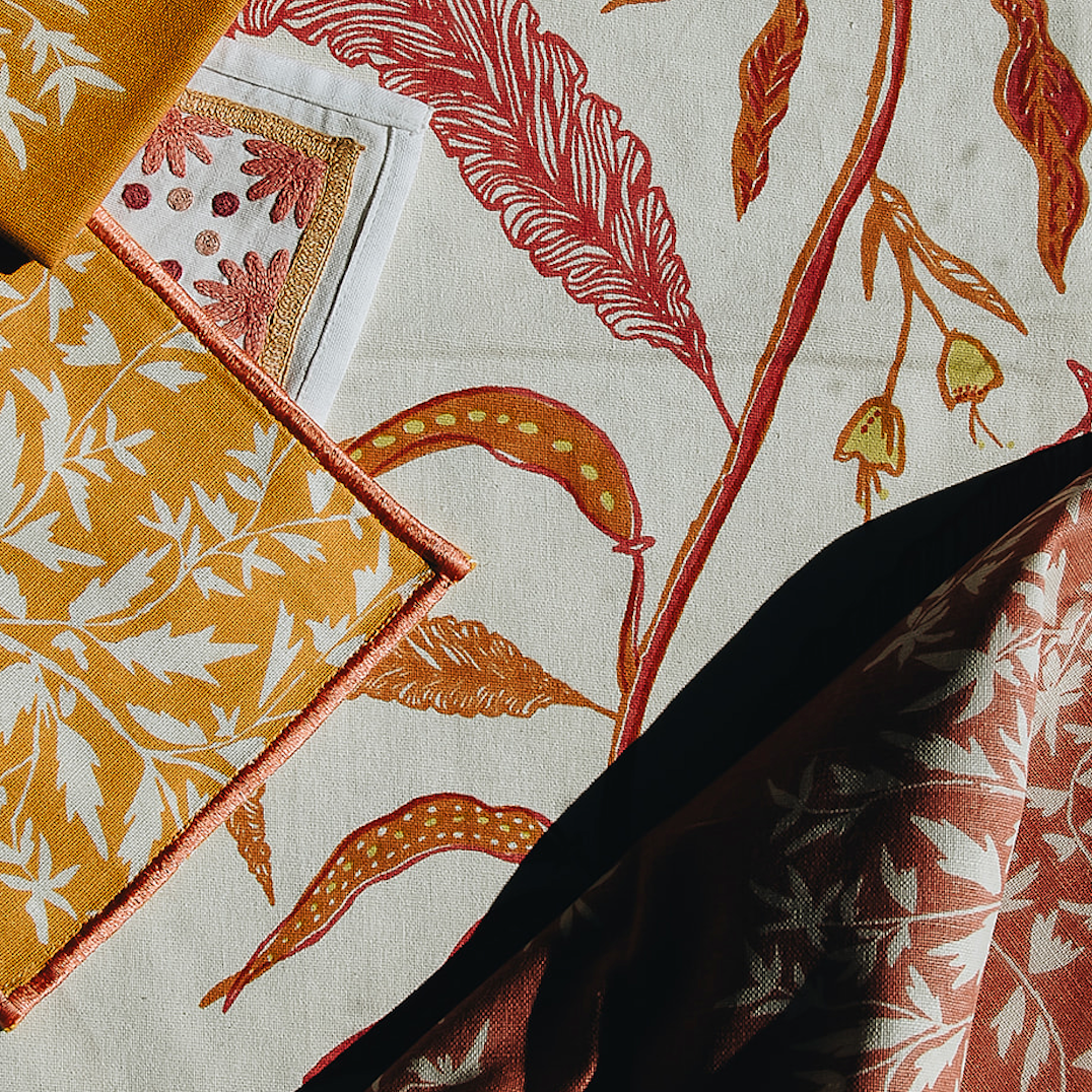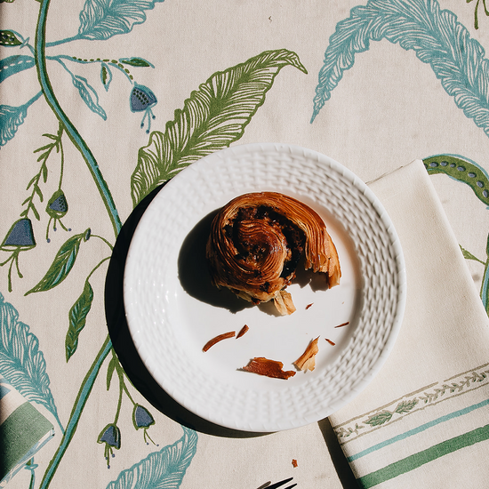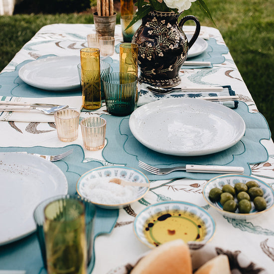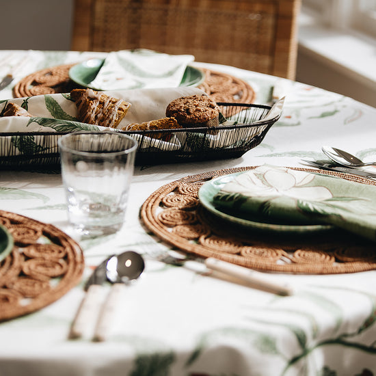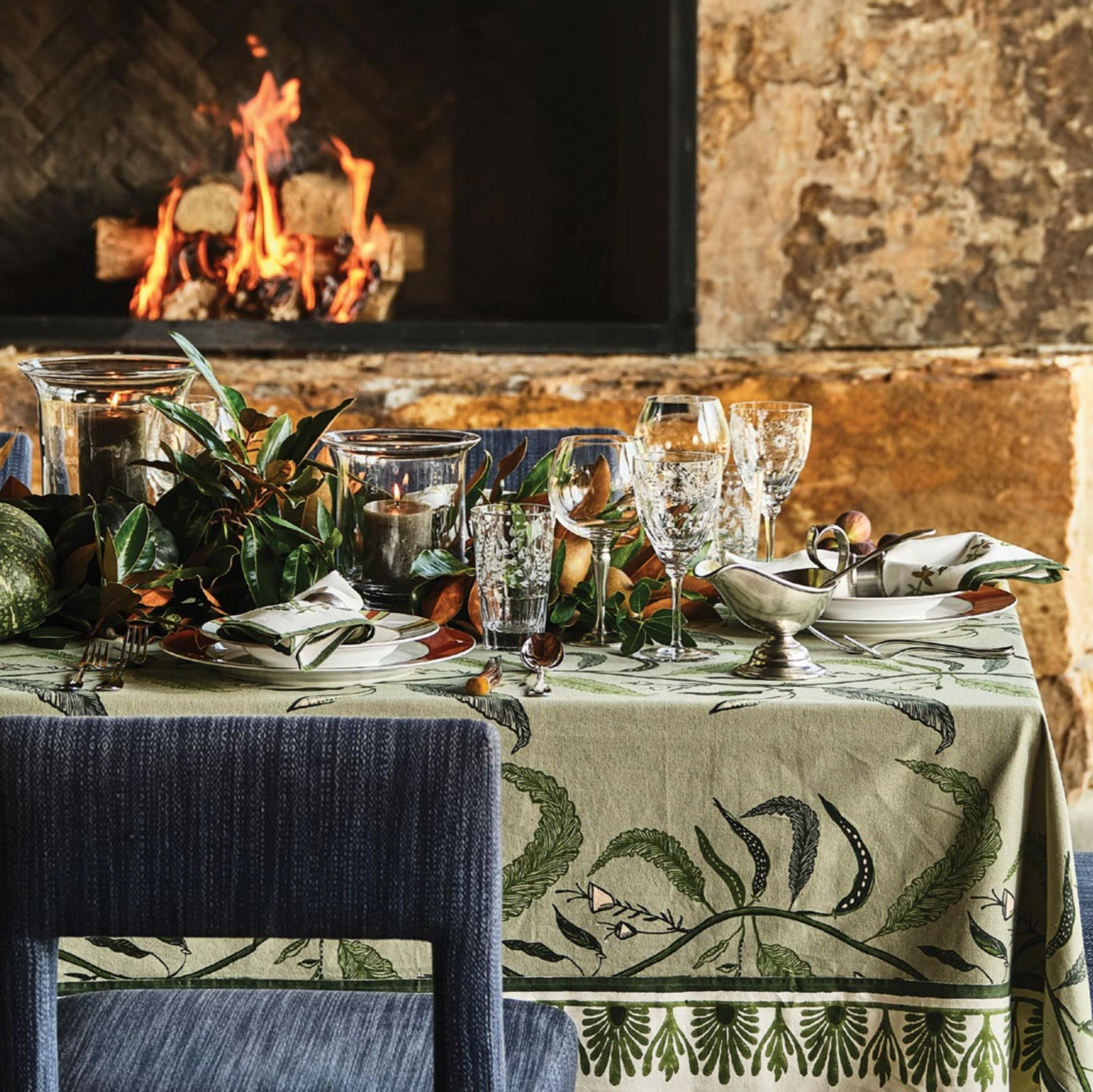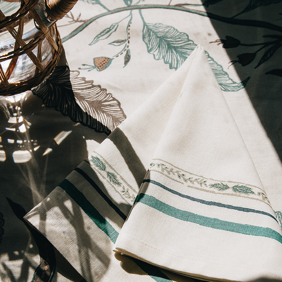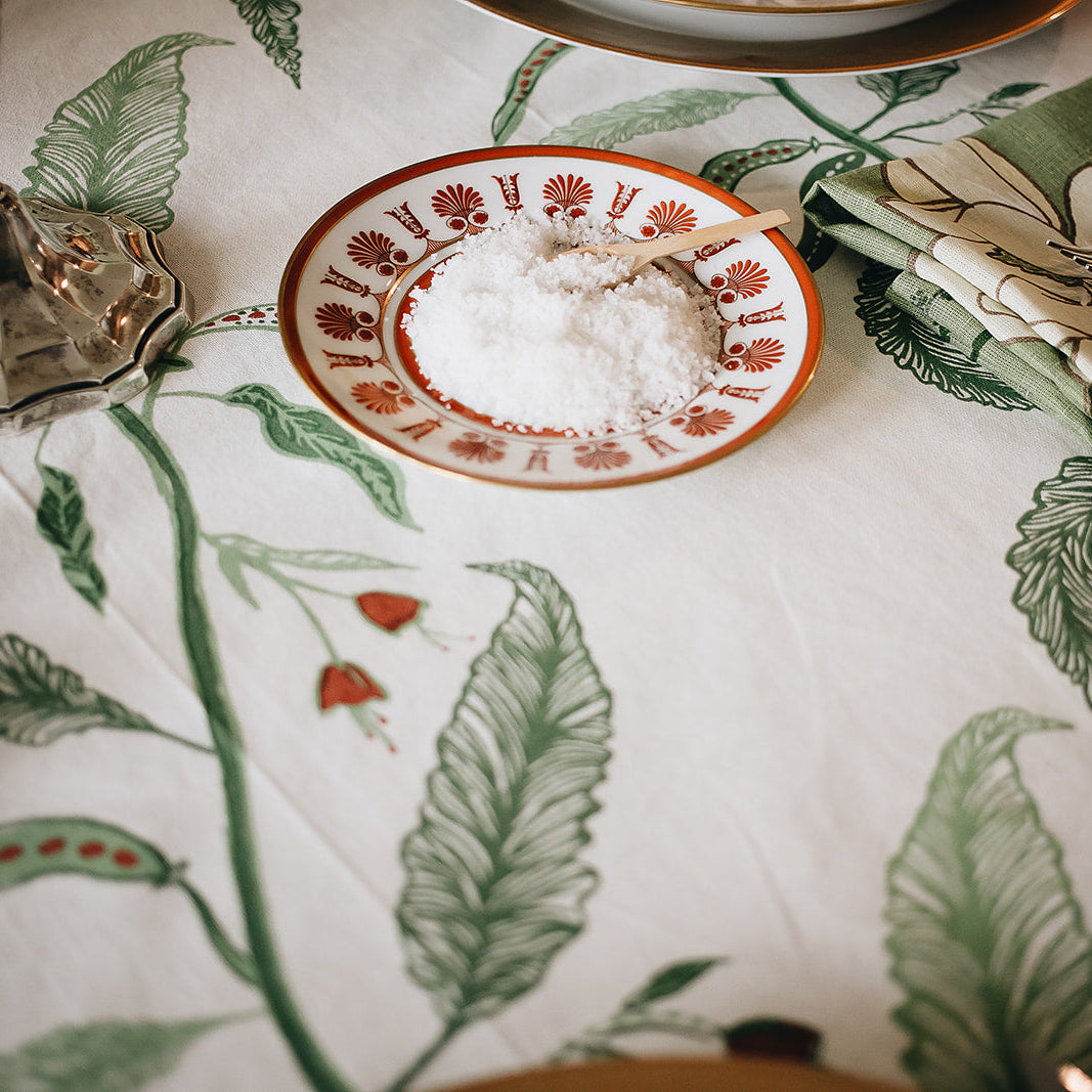 Our Tuileries tablecloth has become a signature design in our collection. The repeated vine motif inspired by European florals comes to life through hand screen printing, and includes and added detail of a block printed trim.
